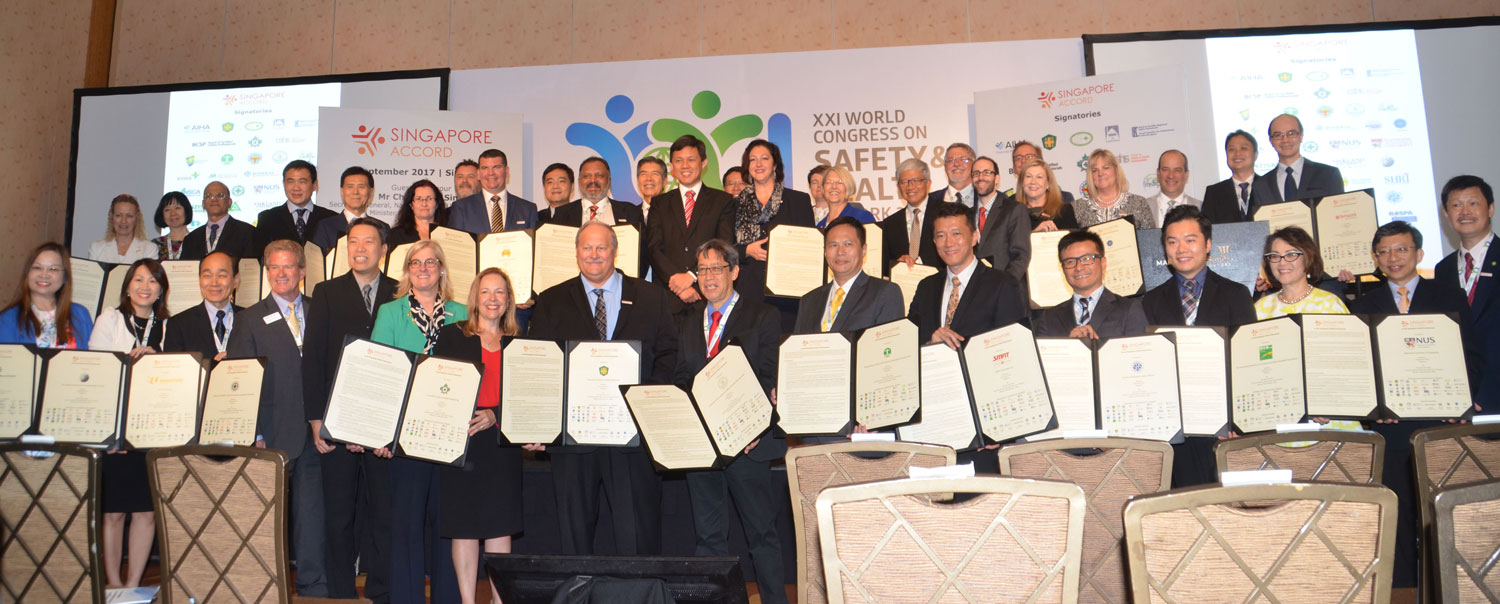 Having met in Singapore on 3 September 2017, at the start of the XXI World Congress on Safety and Health at Work, representatives of business and workers, education institutions, policy-makers in governments and public authorities, OHS professional organisations, and experts in occupational health and safety (OHS) joined the International Network of Safety and Health Practitioner Organisations (INSHPO) and its members to sign the Singapore Accord, a commitment to improving OHS professional and practitioner capabilities so they may more effectively guide and lead the creation of healthier and safer workplaces.